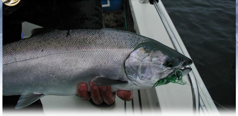 Fly fishing for Chinook salmon is the most challenging, they take the longest time to land and their size and strength offers the ultimate test to the fly fishing angler. The plentiful and aggressive Coho salmon will take a fly more readily and fights on the surface, jumping and running: the perfect fish to take on a fly rod. | ![]() |
